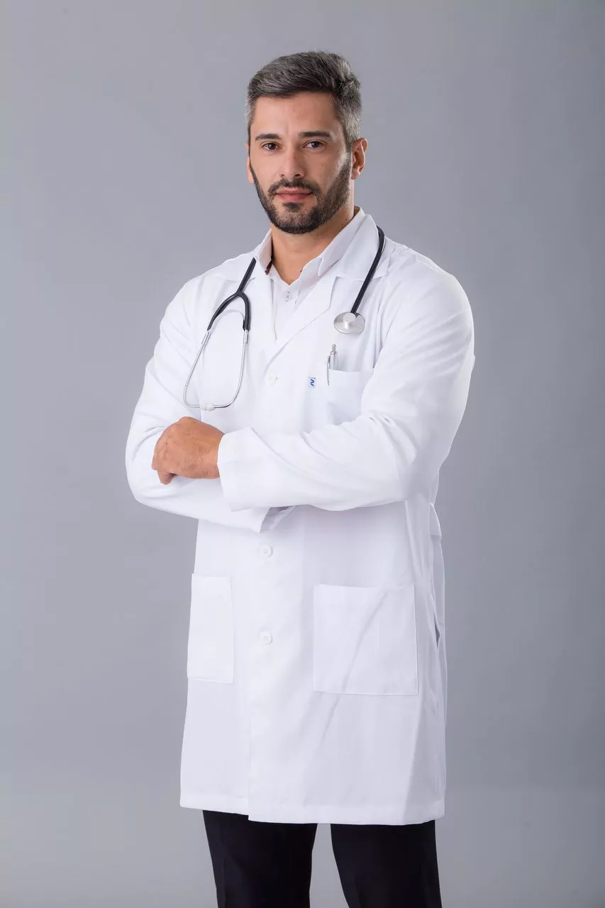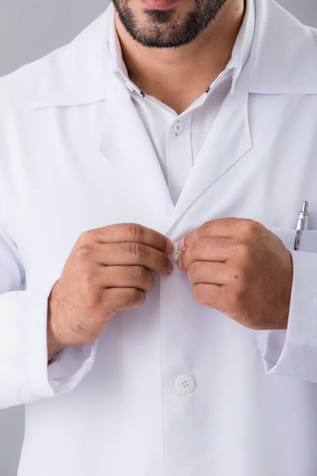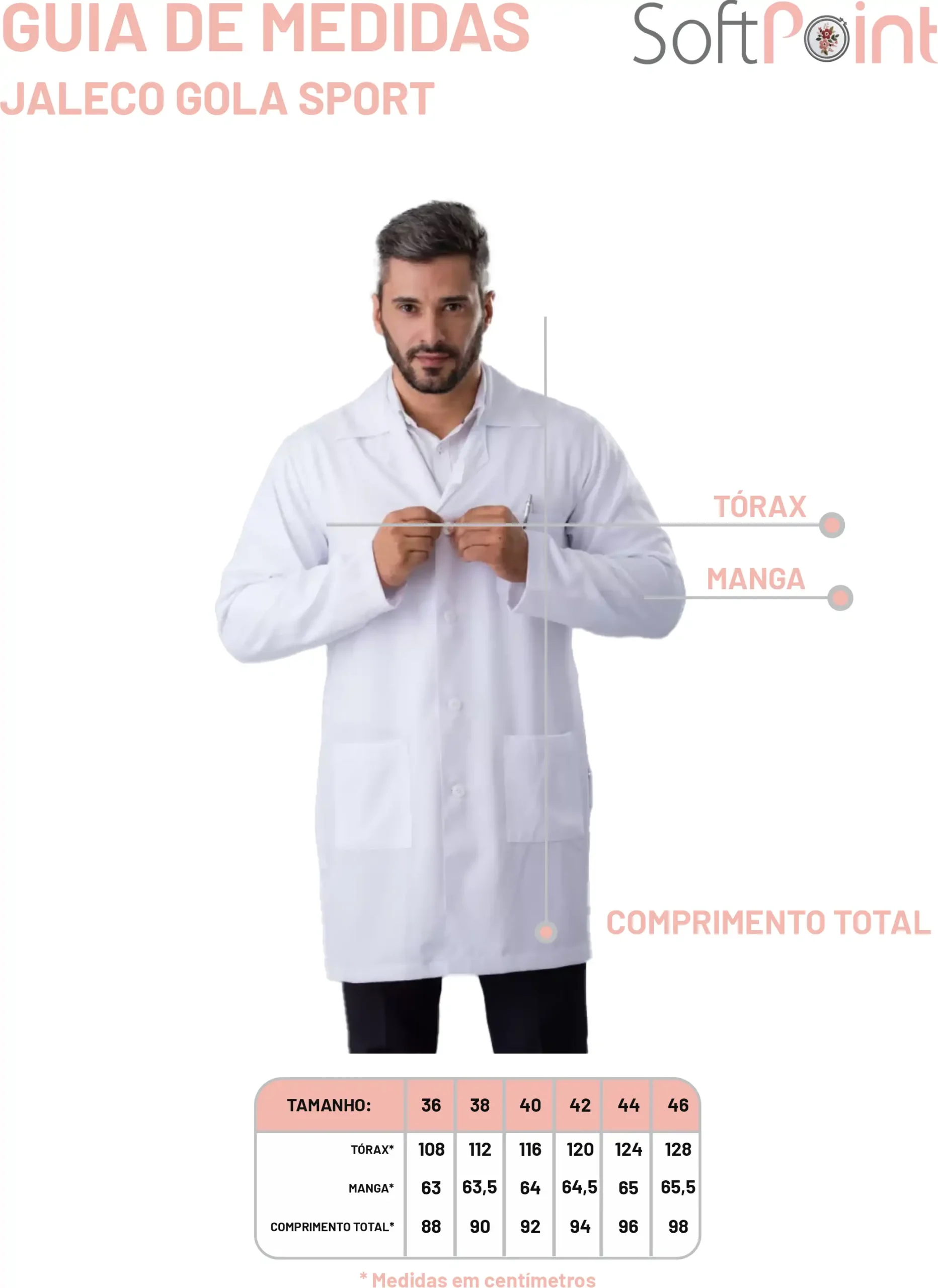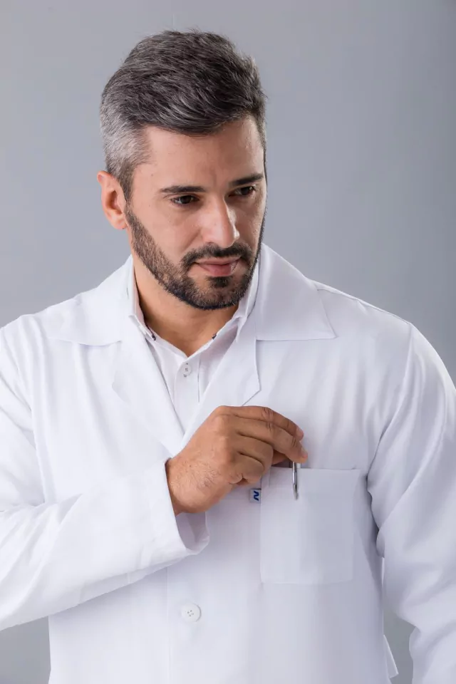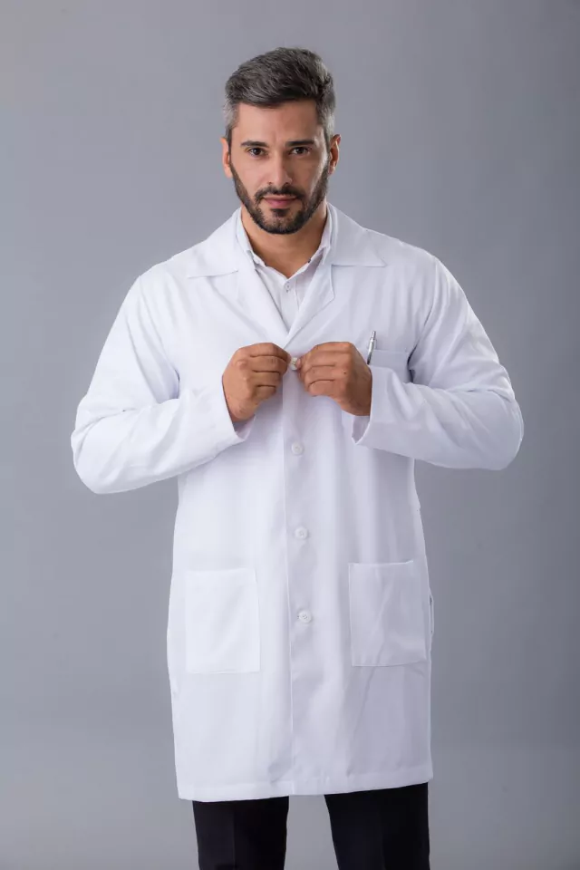 Com três bolsos quadrados grandes ele tem um bom espaço para armazenamento, além de uma abertura lateral que possibilita o contato com os bolsos da roupa que o profissional da saúde veste por baixo do jaleco.